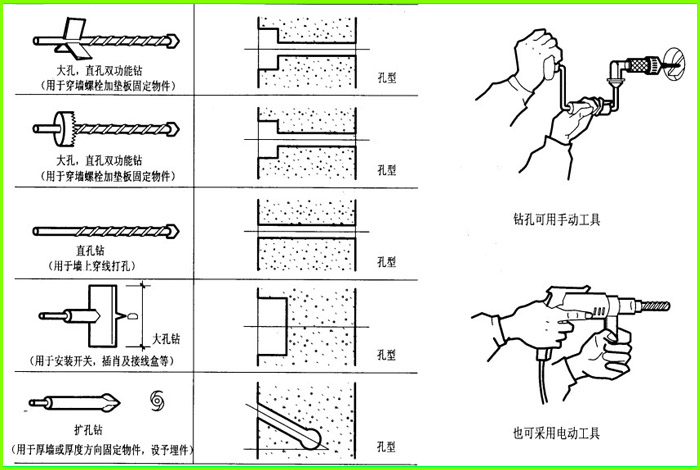 2 、擴孔鉆的形狀如下圖所示,一般可工地自制,用Φ14 ~16 鋼筋一端用火燒紅后打扁,然后兩邊向反方向打彎,斷面呈形開刃后即可。另一端用銑床出插口,插入電鉆即可使用,其使用方法是,進入墻體為直孔,到底后將鉆頭桿繞孔轉動,底部即成擴孔。孔外徑一般為035 、叨.孔頭約為中60 65 ,這要視預埋件大小而定。深度應)100 (如吊掛物較重可適當加大深度)打入時與墻體呈45 度角,用水沖凈孔內渣末,灌聚合物水泥砂漿,插入鐵件。